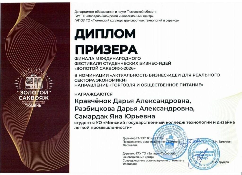 24-25 марта в г. Тюмень состоялся финал Международного фестиваля студенческих бизнес-идей «Золотой саквояж» среди учащихся средних профессиональных учебных заведений России и Беларуси, который прошёл в Тюменском Технопарке.